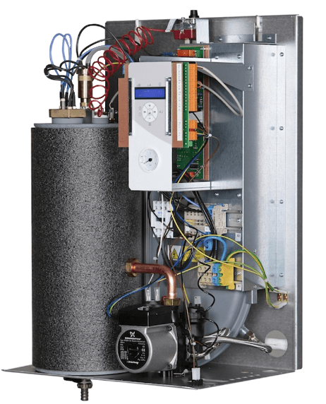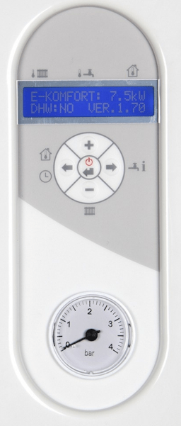 Электрокотел оборудован расширительным баком 8 литров и энергосберегающим циркуляционным насосом GRUNDFOS Cesao. Процесс нагрева воды происходит в теплообменнике котла электрическим ТЭНом с тремя стержнями мощностью по 2 кВт, который контролирует блок управления с функцией безошибочной плавной регулировки температуры. Это обеспечивает экономичную эксплуатацию, как котла, так и всей отопительной системы.