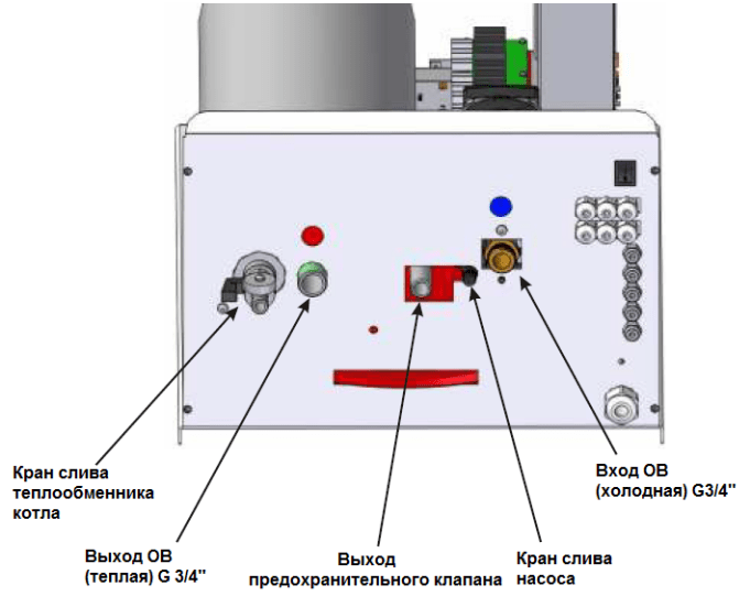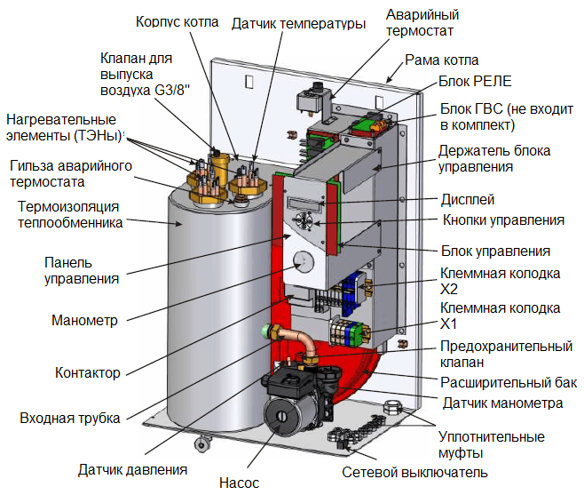 Аварийный термостат установлен на 100°C. В случае перегрева ТЭНы отключаются и работа котла прекращается.